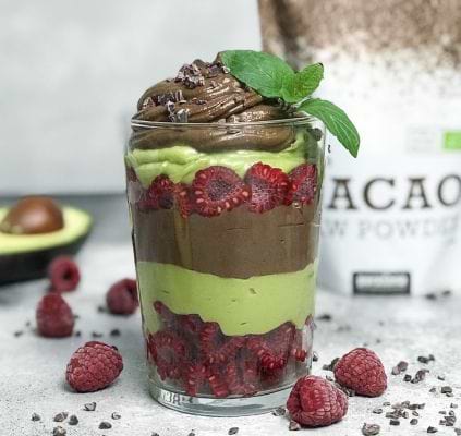 - Répartissez dans 2 verres une couche de framboises, puis une couche de préparation à l'avocat, ensuite une couche de préparation au cacao. Répétez l'opération jusqu'a ce que le verre soit rempli.
