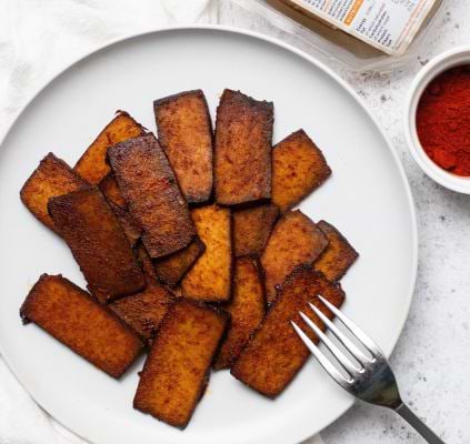 - Disposez le tofu sur du papier cuisson et enfournez à 180°C pendant 35 minutes (retournez-les à mi-cuisson)