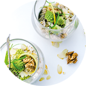 Dans le fond de la verrine, déposer 2 càc de crème de roquefort, 1 càs de pâtes déjà mélangées à la crème de bleu, 1 à 2 bouquets de Romanesco et parsemer d’amandes effilées et torréfiées