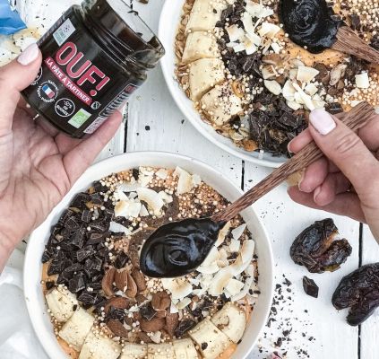 - Verser le mélange dans un bol et ajouter votre pâte à tartiner chocolat-noisettes OUF.