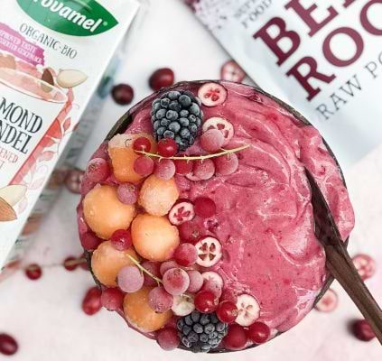 - Dans un blender, mixez les bananes avec les framboises, la poudre de betteraves et le lait d'amande.