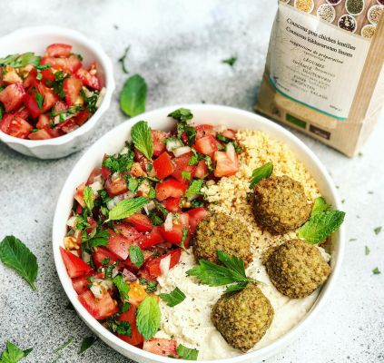 - Dans une assiette, disposer le couscous, les falafels, les tomates, les oignons avec le jus de citron et le houmous. Terminer par les feuilles de menthe.