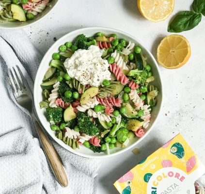 Fusilli de riz aux brocolis, courgettes et petits pois