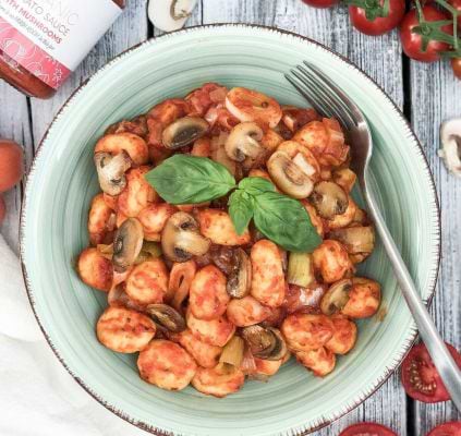 - Faites cuire les gnocchis dans de l’eau bouillante salée 1 à 2 minutes, jusqu’à ce qu’ils flottent à la surface. Retirez-les de la casserole avec une écumoire et incorporez-les à la sauce. Ajoutez le basilic et remuez.