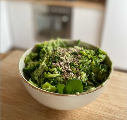 - L’accompagnement de votre choix. Ici quinoa, brocoli, pousses d’épinards et mix de graines.
