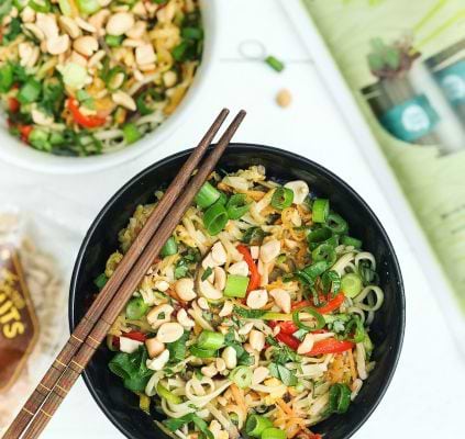Mettre le tout dans un plat, décorer avec les cacahouètes et la coriandre, oignon jeune, basilic coupé
