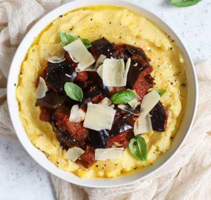 - Servez la polenta avec la compotée d’aubergines en la décorant de basilic et de copeaux de parmesan.