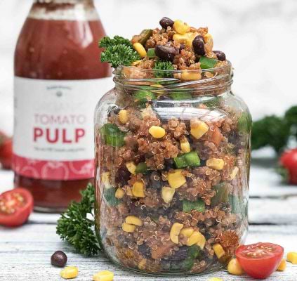 - Ajoutez ensuite les haricots rouges, le maïs, les épices et le poivre. Mélangez et laissez chauffer encore 2 minutes, puis servez immédiatement.
