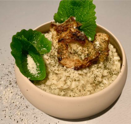 - Une fois le bouillon épuisé et quasiment évaporé ajouter le parmesan, le sel, le poivre et l’ail des ours.