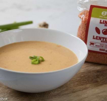 - Retirer les tiges de citronnelle et passer la soupe au mixeur. Ajouter le lait de coco, la sauce de soja et le jus de citron vert et passer à nouveau au mixeur. Avant de servir, garnir de tiges d'oignons émincées.