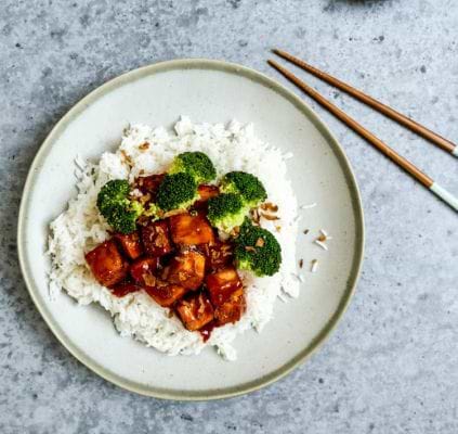 - Votre tofu est prêt, vous n’avez plus qu’à le disposer dans votre assiette, avec l’accompagnement ou dans plusieurs petits bols différents. C’est sympa à partager et n’oubliez pas les oignons frits c’est délicieux avec !