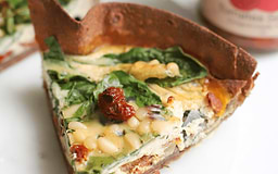 Versez la préparation dans le fond de tortilla. Ajoutez les épinards, les oignons, les tomates, les pignons de pin, le thon émiété et saupoudrez de levure noble.