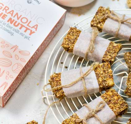 - Dans un bol, ajoutez le beurre de cacahuètes, le granola, les graines de lin, les graines de sésame, la cannelle et la purée d'abricots, mélangez jusqu'à ce que le tout soit bien enrobé.
