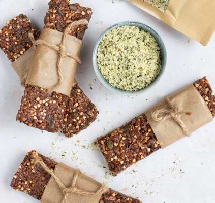 - Pendant ce temps, mélanger dans un saladier le sarrasin, les graines de courge, de tournesol, de chanvre, les raisins secs, les éclats de cacao, le cacao en poudre, le sucre de coco et les protéines de chanvre.