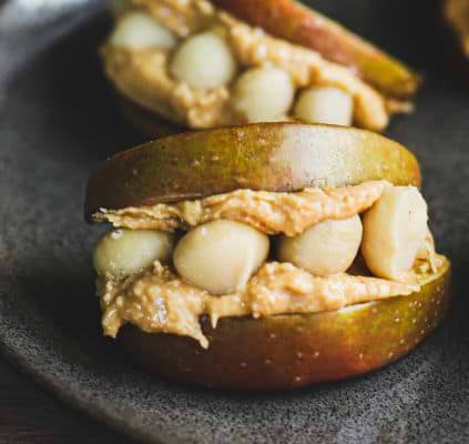 - Mettre des noix de macadamia sur le beurre de cacahuètes pour représenter les dents et ajouter par-dessus une tranche de pomme avec du beurre de cacahuètes. La partie avec le beurre de cacahuètes doit être posée par dessus les noix de macadamia.