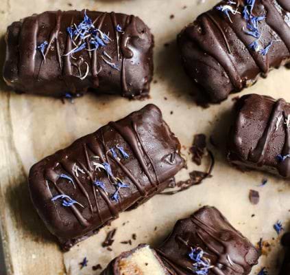 - Placez les barres recouvertes de chocolat sur une feuille de papier sulfurisé et remettez-les au congélateur pendant 10 minutes avant de les servir.