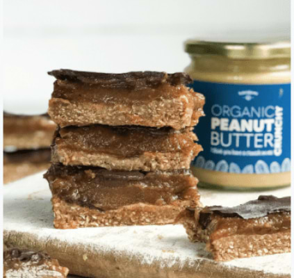 - Pour faire la base, broyez les noix de cajou et l'avoine dans un blender jusqu'à l’obtention d’une farine. Ajoutez 1/3 de la sauce caramel aux dattes et 3 cuillères à soupe de purée de cacahuète croquante, mélangez bien le tout. Versez le mélange sur une plaque de cuisson et formez une base de 1 à 2 cm d'épaisseur. Placez la plaque au congélateur pendant 30 minutes.
