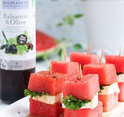 - Wissel blokjes watermeloen, mozzarella en peterseliebladeren af op de tandenstoker.