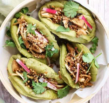 Glutenvrije en vegan Bao buns met matcha en pulled jackfruit
