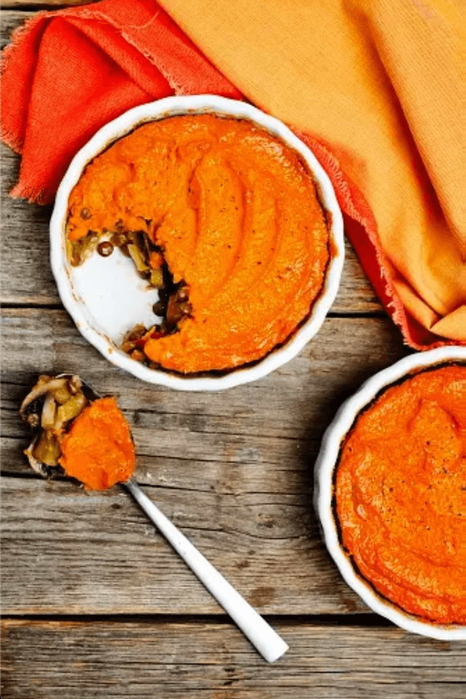 - Verdeel de linzen en groenten sojasnippers in ramekins. Bestrooi met de resterende kokosmelk en bedek met zoete aardappelpuree.