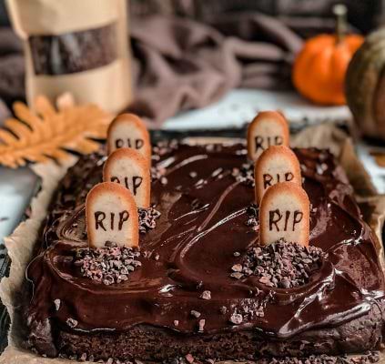 - Zodra de taart koud is, bedek je hem met chocoladeglazuur (200g gesmolten chocolade met 70ml sojacrème).