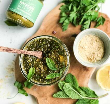 - Voeg het citroensap toe aan het munt- en peterseliemengsel.