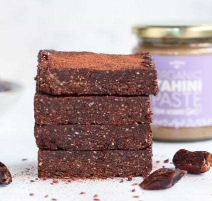 - Voeg de dadels toe en pureer door de keukenrobot enkele seconden achter elkaar te laten draaien met de tahini, rozijnen, rijstsiroop, chiazaden, cacao, vanillezaden en zeezout tot er zich een balletje deeg begint te vormen.